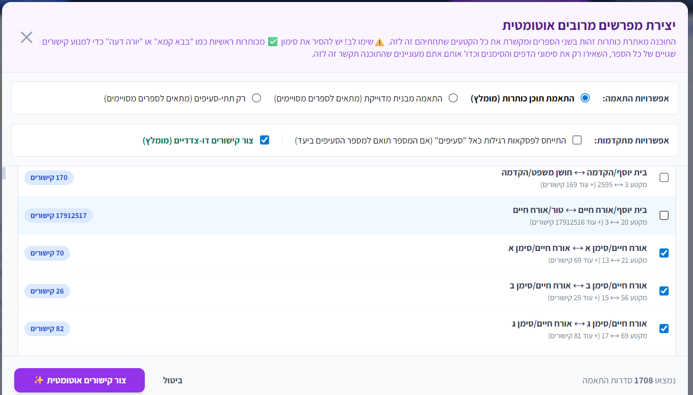 אם קטע השני שנבחר הוא כותרת התוכנה תיצור קישורים בין הקטע המקור לכל קטע שתחת אותו כותרת עד הכותרת הבאה בספר המקור באותו רמה.