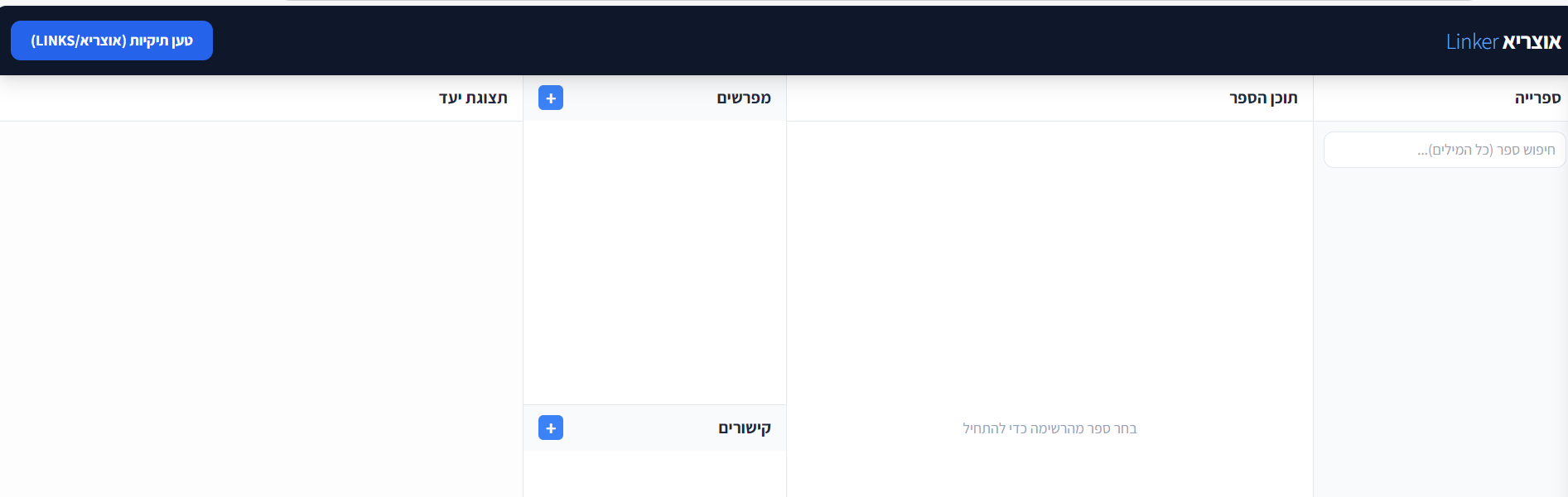 למי שרוצה ליצור מפרשים וקישורים חדשים לספרים באוצריא, בקלות ובמהירות, וכן למי שרוצה לערוך או למחוק מפרשים וקישורים קיימים באוצריא.