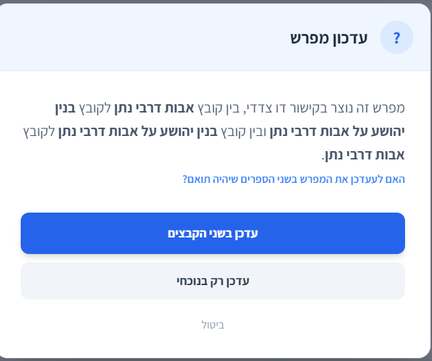 שלב ו: בעת השמירה התוכנה תשאל אותכם אם להגדיר קישור/מפרש כפול מספר 1 לספר 2 וכן מספר 2 לספר 1 כמו כל קישורי ומפרשי או לעשות קישור רק בספר הנוכחי.